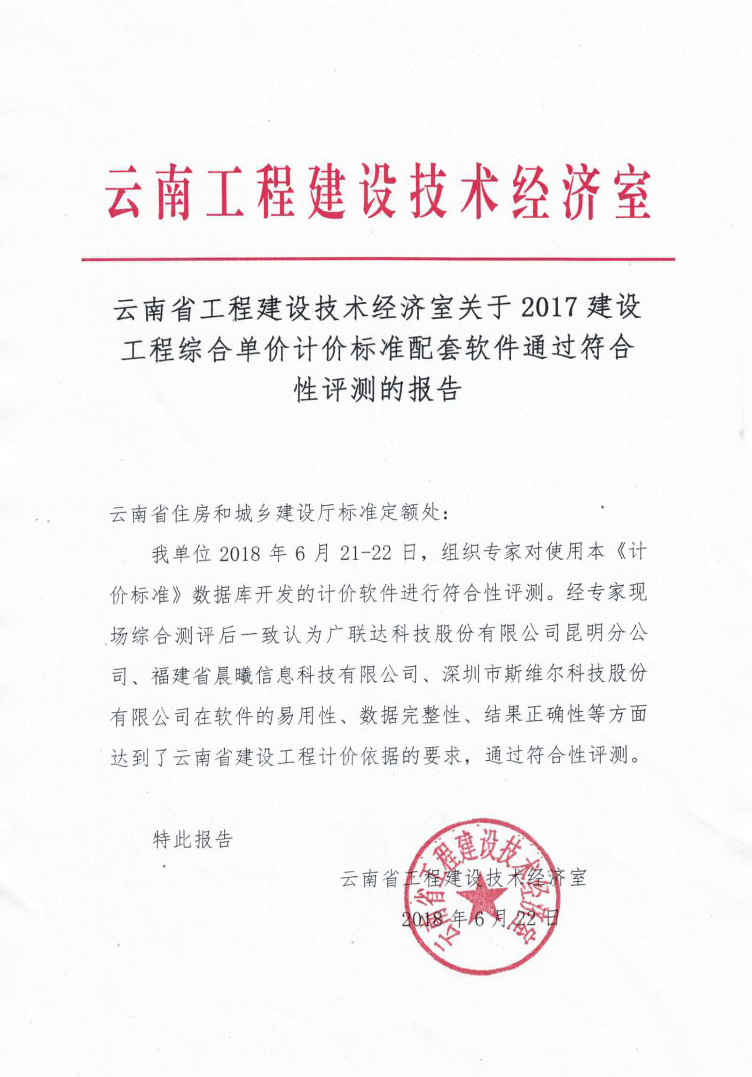 云南省工程建设技术经济室关于2017建设工程综合单价计价标准配套软件通过符合性评测的报告