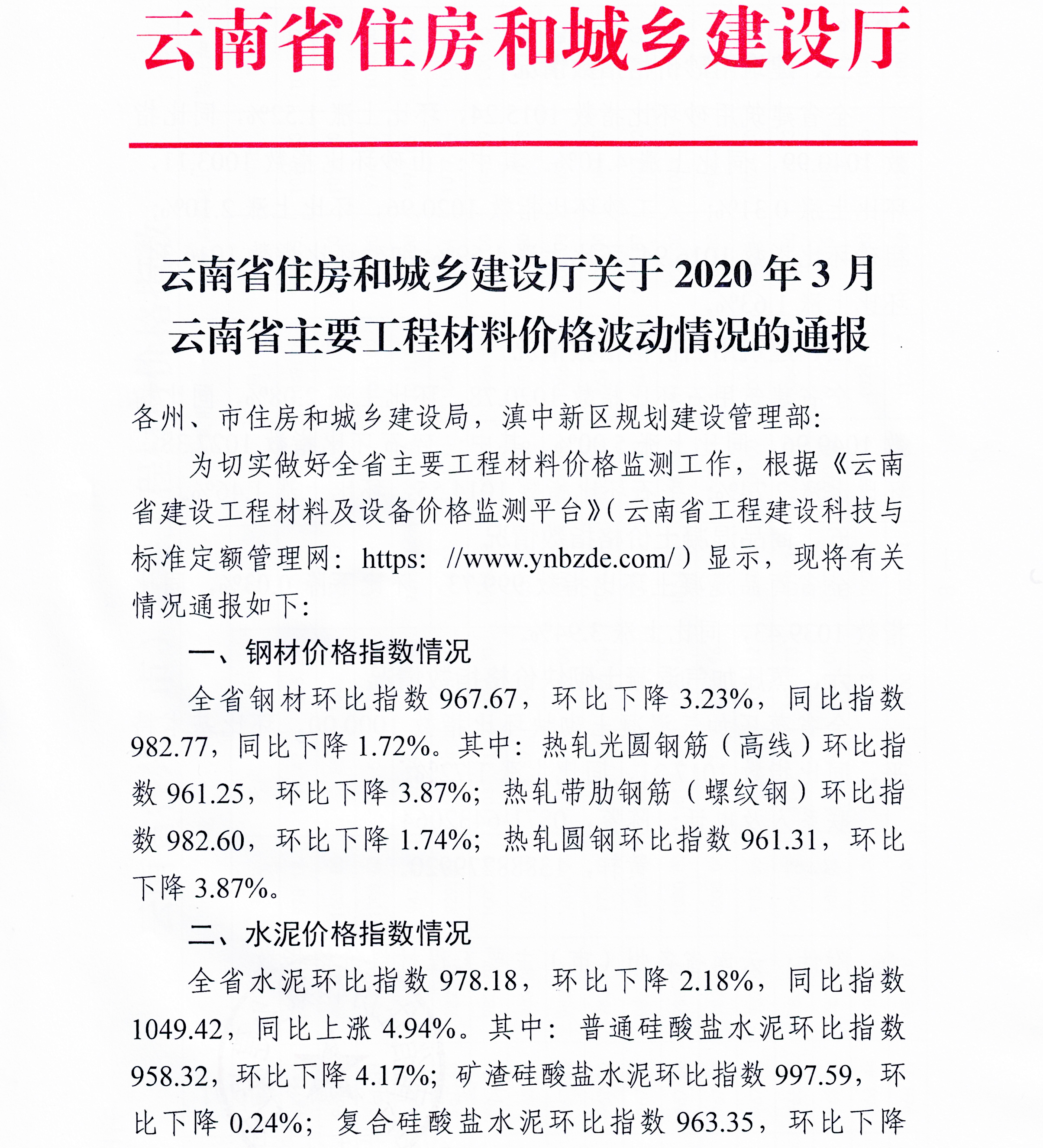 云南省住房和城乡建设厅关于2020年3月云南省主要工程材料价格波动情况的通报